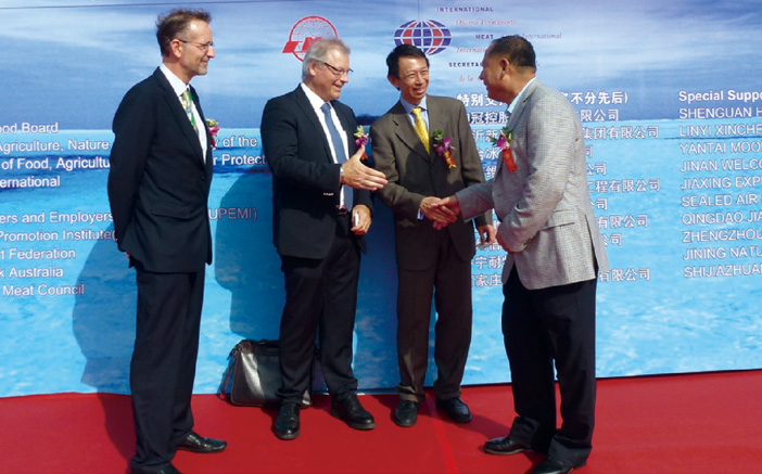 2013年10月13日,第十一屆中國(青島)國際肉類工業展覽會上,大莊園集團董事長陳希濱與世界肉類組織主席阿圖羅·拉瓦洛友好交談。