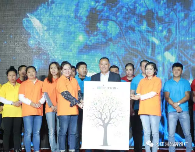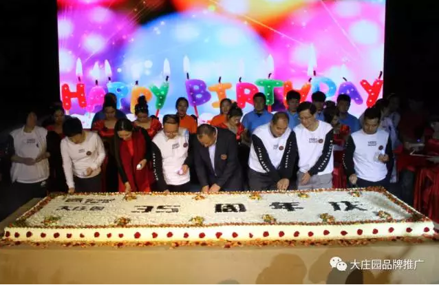 長3米5的35周年生日蛋糕推至臺前,它代表莊園35年的事業(yè)步步高升,蒸蒸日上。現(xiàn)場700余名員工集體合唱《生日歌》,并且大莊園全體員工為董事長準(zhǔn)備了一棵由每一位莊園員工的指紋組成的莊園樹。“一棵樹,一家人”代表著所有莊園人在大莊園這棵大樹下吸取養(yǎng)分,茁壯成長。